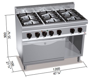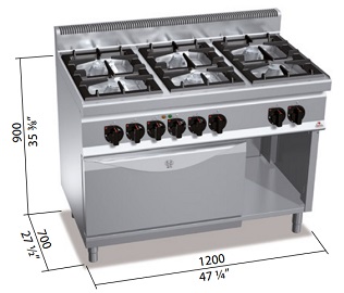 Gas Cooker with Gas Oven GN1/1. 7kW + 3.5kW + 7kW + 3.5kW + 3.5kW + 7kW. 30.524kcal/h. 121.131Btu/h. Oven: 4kW. Tray : 530 x 325mm (x3 pos). 129x79x121H. 126kg. Standard : Stainless steel burner’s trays – Oven’s piezoelectric ignition. , Life-guaranteed nickel-plated cast iron high power burners with single