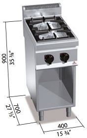 * Professional gas burners made in ITALY * Made in stainless steel with CE certification * On an open stand * HIGH POWER double crown burners * Independent position selectors of the flame * Pilot flame and safety thermocouple * Burners’ power: 7Kw * Total power: 14Kw (12.040Kcal/h) * Weight: 38Kg *