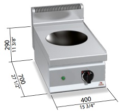 Main characteristics Installation| tabletop, —|—, Number of burners| one, Burner size| 300 mm, Burner| induction, wok, Voltage| 220 V, Power| 3.5 kW, Width| 400 mm, Depth| 700 mm, Height| 290 mm, Weight (unpacked)| 30 kg, Manufacturer country| Italy, , Description Induction range WOK Berto’s E7WOK-B / IND macros 700 series is designed