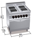 Worktop and front panels of AISI 304 stainless steel. Pressed top in a unique watertight piece. Cast iron plates with safety thermostat and 6-position selector that activates 6 different concentric power zones. Voltage light and power light. Electric static oven completely made of STAINLESS STEEL with 4 levels for grids/pans. Grill with salamander function on the upper side and a thermostat for the correct regulation of temperature from 50° a 270° C. Pilot light and temperature indicator light. Pressed door and counter door made of AISI 304 steel. High resistance door handle of AISI 304 steel of 20/10 thickness. Adjustable feet. Standard: no. 1 anti-tilting oven grid. , , ,